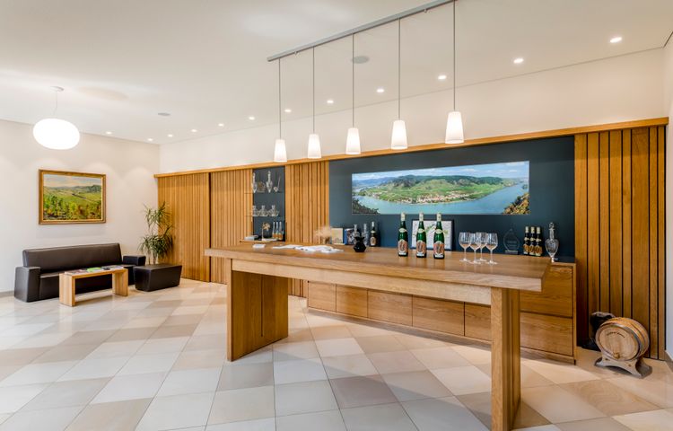 Der ebenfalls in Schönbrunnergelb gehaltene Neubau des Weingutes befindet sich rückseitig des Stammhauses auf der gegenüberliegenden Straßenseite. Hier lädt ein stilvoll eleganter Verkostungsraum zum Gustieren der herausragenden Knoll-Weine.