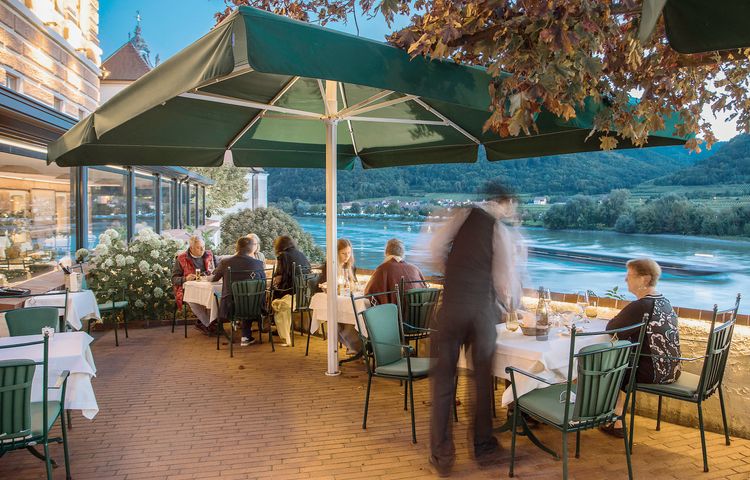 Von der herrlichen Restaurantterrasse hat man einen unvergleichlichen Blick über das Donautal. Auf feinstem Niveau bewegt sich die vielfach ausgezeichnete Küche, und kaum zu übertreffen ist das bestens sortierte Weinangebot auf Schloss Dürnstein.