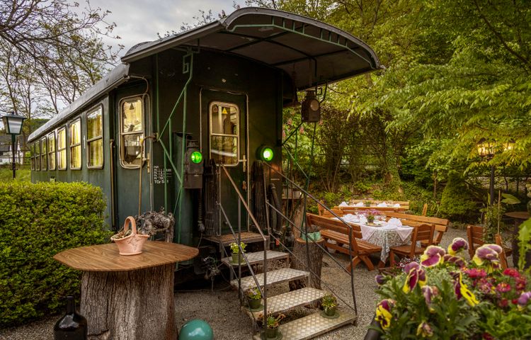 Der umgestaltete ehemalige Eisenbahnwaggon im Garten dient heute als origineller Rahmen für kleine Feiern.