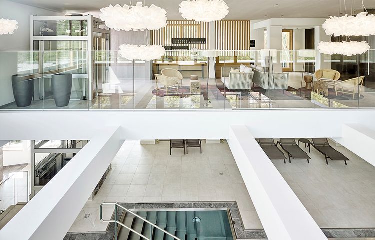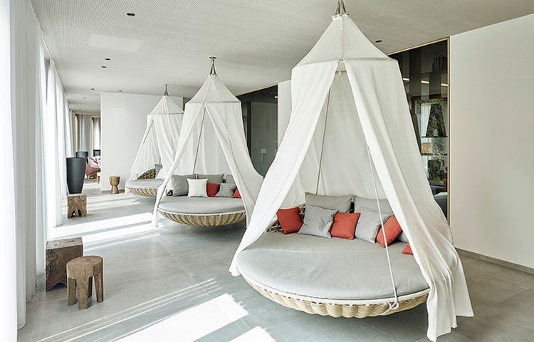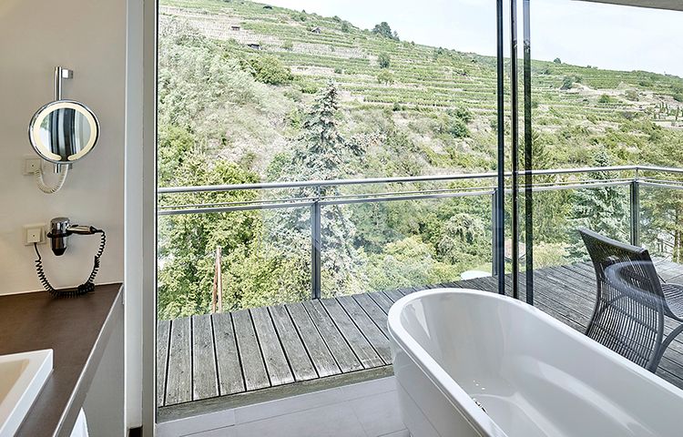 ENTSPANNEN: Ein wahrer Ort der Ruhe und Erholung ist der 3.000 m² große Wellnessbereich „SPA World Luxury“. Panoramablicke auf die umliegenden Weinreben versprechen der 17 Meter lange Infinity-Innenpool, 3 Saunen, Außenpool, großzügige Ruheoasen mit offenen Kaminen sowie Whirlpool im Freien. Die speziellen Wine-Fine-Treatments pflegen mit Weinextrakten, Aroma-Essenzen und Traubenkernen.