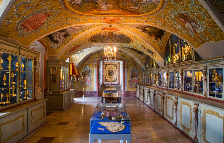 Im Inneren der Basilika lohnt die reich gefüllte Schatzkammer einen Besuch. Hier werden alle, in den rund 350 Jahren gespendeten Votivgaben, wie edelsteinverzierte Kelche oder kunstvolle Altarnachbildungen, aufbewahrt. Beeindruckend sind außerdem die vergoldeten Eichenholz-Beichtstühle, das marmorverzierte Kirchenportal, die prächtigen Fresken sowie der vorchristliche Opferstein. Eine außergewöhnliche Sehenswürdigkeit im Ortszentrum ist die mechanische Krippe, ein denkmalgeschütztes Kunstwerk mit über 300 verschiedenen Figuren, sowie das sagenhafte Alpenpanorama.