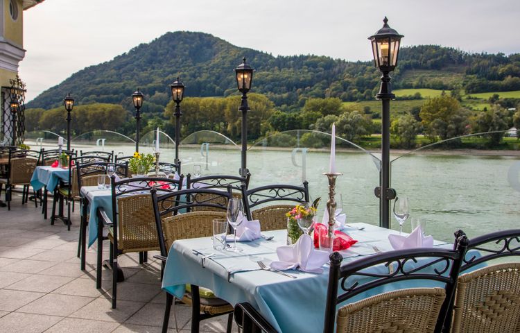 3 Restauranträume mit 80, 60 und 50 Plätzen; 30 im lauschigen Arkadenhof und 120 auf der Donau-Terrasse; Hausbar, Wein- und Heurigenkeller. Neu: Veranstaltungssaal für Hochzeiten, Familienfeiern und Seminare bis zu 100 Personen. Küche: 12 bis 20 Uhr durchgehend. Küchenlinie: gehobene heimische und saisonal orientierte Küche mit Zutaten aus der Region. Preise: Vorspeisen ab € 10,50; Hauptgerichte ab € 16,50; Desserts € 6,50. 5-gängige Menüs ab € 55,–.