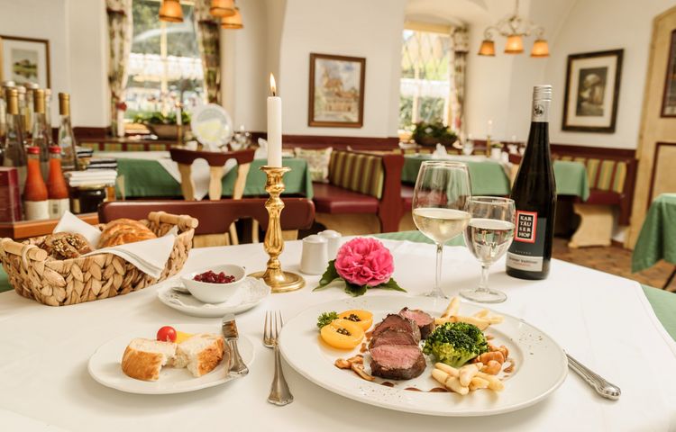 70 (Restaurant), 70 (Terrasse) Plätze. Küche: 11 bis 20 Uhr durchgehend; Ruhetag: in der Hauptsaison voraussichtlich täglich geöffnet, Nebensaison variabel. Küchenlinie: verfeinerte Hausmannskost. Besondere Räumlichkeiten für Veranstaltungen, Feiern und Tagungen. Betriebsferien: Jan, Feb. Preise: Vorspeisen € 7,– bis € 19,–; Hauptgerichte € 15,– bis € 40,–; Desserts € 5,– bis € 14,–.