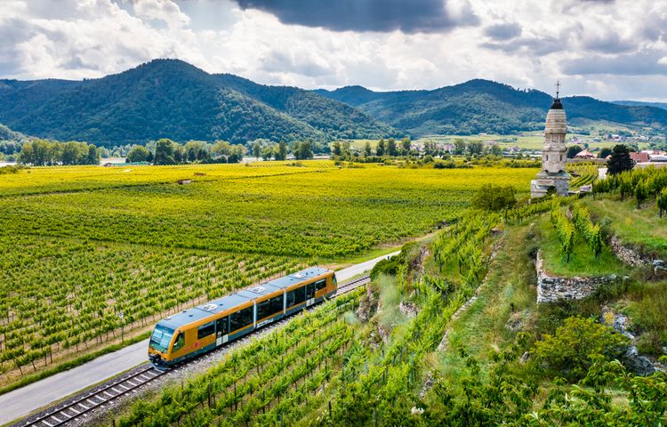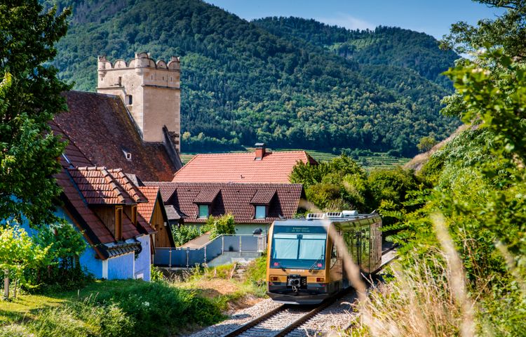 Am Bahnsteig 21 des Bahnhofs Krems ist alles ein bisschen anders. Statt mit Koffern oder Reisetaschen warten die Passagiere hier mit Wanderrucksäcken, und nicht wenige von ihnen heben ein Fahrrad in einen der goldlackierten Waggons der Wachaubahn, die die 34 Kilometer lange Strecke zwischen Krems und Emmersdorf befährt.